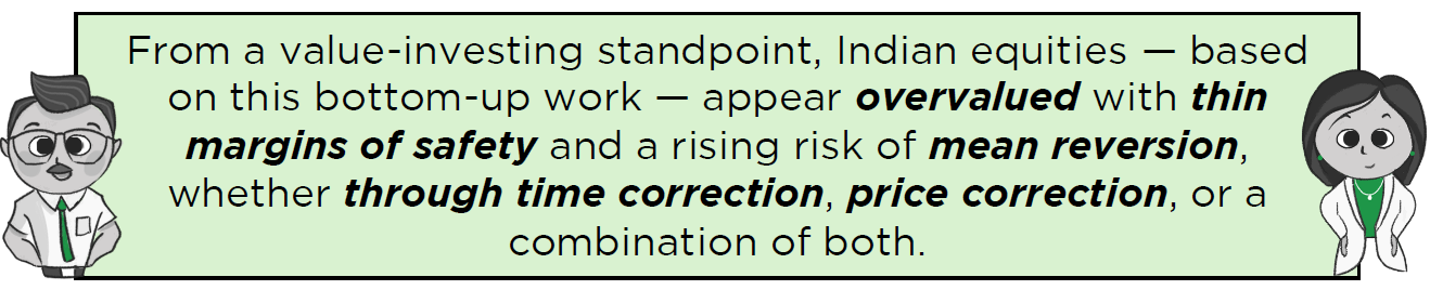 - Market breadth is deteriorating: in the mid-cap and large-midcap segments, nearly half the stocks have negative 1-year returns, even as the indices hover near their 52-week highs.
