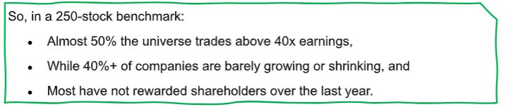 - In many segments, 40–60% of stocks trade above 40x–50x earnings.